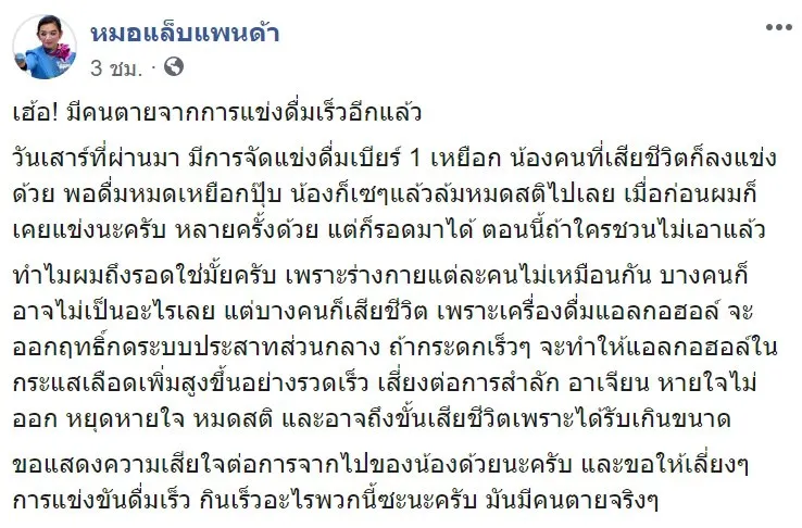 ด้านเพจดังอย่างหมอเเล็บแพนด้าก้ได้โพสท์เตือนเกี่ยวกับเรื่องนี้เช่นกัน โดยระบุว่า เฮ้อ! มีคนตายจากการแข่งดื่มเร็วอ