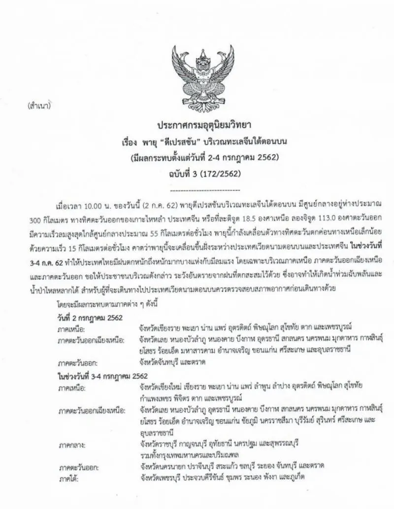 ในช่วงวันที่ 3-4 ก.ค. 62 ทำให้ประเทศไทยมีฝนตกหนักถึงหนักมากบางแห่งกับมีลมแรง โดยเฉพาะบริเวณภาคเหนือ ภาคตะวันออกเฉียงเหนือ และภาคตะวันออก ขอให้ประชาชนบริเวณดังกล่าว ระวังอันตรายจากฝนที่ตกสะสมไว้ด้วย ซึ่งอาจทำให้เกิดน้ำท่วมฉับพลันและน้ำป่าไหลหลากได้ สำหรับผู้ที่จะเดินทางไปประเทศเวียดนามตอนบนควรตรวจสอบสภาพอากาศก่อนเดินทางด้วย โดยจะมีผลกระทบตามภาคต่าง ๆ ดังนี้