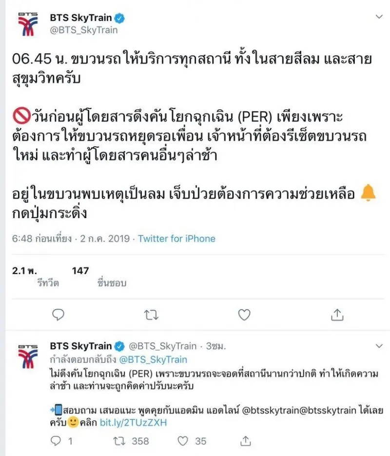 เมื่อวันที่ 2 ก.ค. นายสุมิตร ศรีสันติธรรม ผู้อำนวยการใหญ่สายปฏิบัติการ เปิดเผยถึงกรณีเหตุผู้โดยสารดึงคันโยกฉุกเฉิน (PER - Passenger Emergency Release หรือ พี อี อาร์) เพื่อให้ขบวนรถจอดคอยเพื่อนที่เข้าขบวนไม่ทัน เกิดขึ้นในช่วงประมาณเที่ยง วันที่ 30 มิ.ย.ที่ผ่านมา เบื้องต้นพบเป็นกลุ่มชาวต่างชาติที่ขึ้นบีทีเอสที่สถานีหมอชิต แต่จังหวะที่ประตูจะปิด ได้มีการดึงคันโยกเพื่อรอเพื่อน นอกจากนี้ยังพบว่ากลุ่มเดิมได้ขึ้นที่สถานีสยาม แต่ก็ได้มีการดึงคันโยกอีก ด้วยเหตุผลเดิมคือ รอเพื่อน ซึ่งได้มีการตักเตือนและแนะนำไปเป็นที่เรียบร้อย