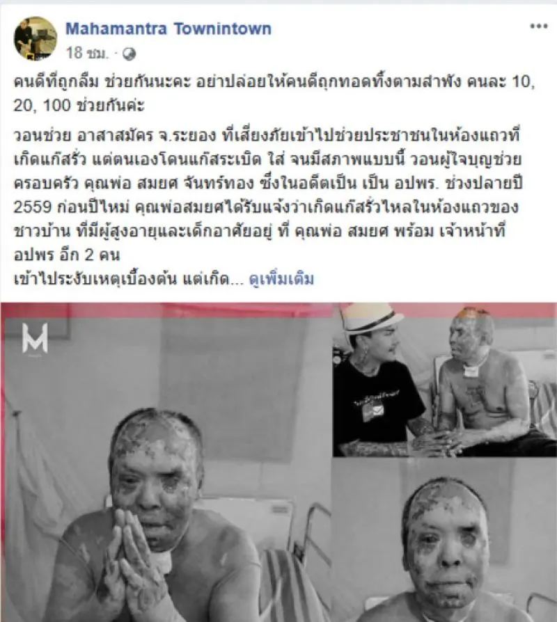 วอนช่วย อาสาสมัคร จ.ระยอง ที่เสี่ยงภัยเข้าไปช่วยประชาชนในห้องแถวที่เกิดแก๊สรั่ว แต่ตนเองโดนแก๊สระเบิด ใส่ จนมีสภาพแบบนี้ วอนผู้ใจบุญช่วยครอบครัว คุณพ่อ สมยศ จันทร์ทอง ซึ่งในอดีตเป็น เป็น อปพร. ช่วงปลายปี 2559 ก่อนปีไหม่ คุณพ่อสมยศได้รับแจ้งว่าเกิดแก๊สรั่วไหลในห้องแถวของชาวบ้าน ที่มีผู้สูงอายุและเด็กอาศัยอยู่ ที่ คุณพ่อ สมยศ พร้อม เจ้าหน้าที่ อปพร อีก 2 คน เข้าไประงับเหตุเบื้องต้น แต่เกิดแก๊สระเบิดขึ้น ความรุนแรงของแก๊สระเบิดทำให้ทุกๆ คนกระเด็น ไปคนละทิศละทาง และคลานออกมา ในสภาพที่ไฟลุกท่วมทั้งตัว