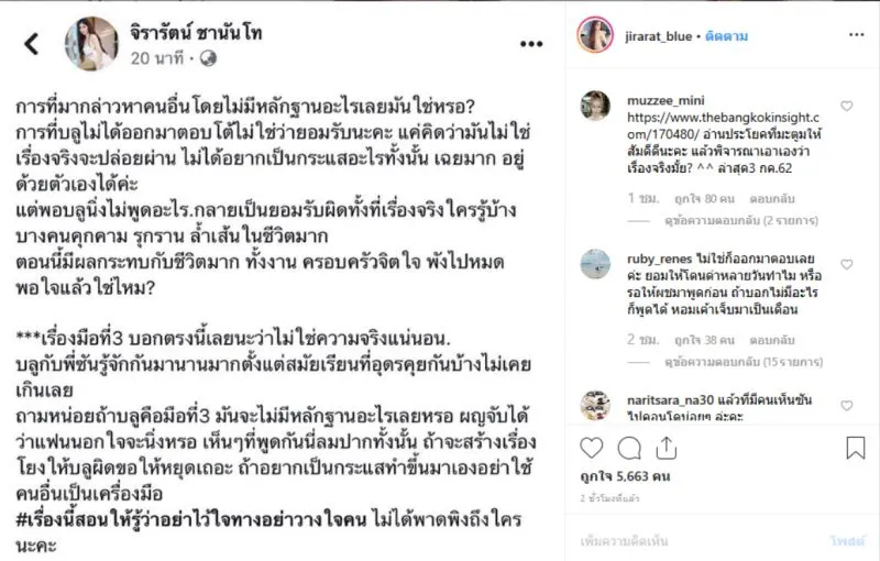 เรื่องมือที่ 3 บอกตรงนี้เลยนะว่าไม่ใช่ความจริงแน่นอน บลูกับพี่ซันรู้จักกันมานานมาก ตั้งแต่สมัยเรียนที่อุดร คุยกันบ้างไม่เคยเกินเลย ถามหน่อยถ้าบลูคือมือที่ 3 มันจะไม่มีหลักฐานอะไรเลยหรอ ผู้หญิงจับได้ว่าแฟนนอกใจจะนิ่งหรอ เห็นๆ ที่พูดกันนี่ลมปากทั้งนั้น ถ้าจะสร้างเรื่องโยงให้บลูผิดขอให้หยุดเถอะ ถ้าอยากเป็นกระแสทำขึ้นมาเองอย่าใช้คนอื่นเป็นเครื่องมือ #เรื่องนี้สอนให้รู้ว่าอย่าไว้ใจทางอย่าวางใจคน ไม่ได้พาดพิงถึงใครนะคะ”