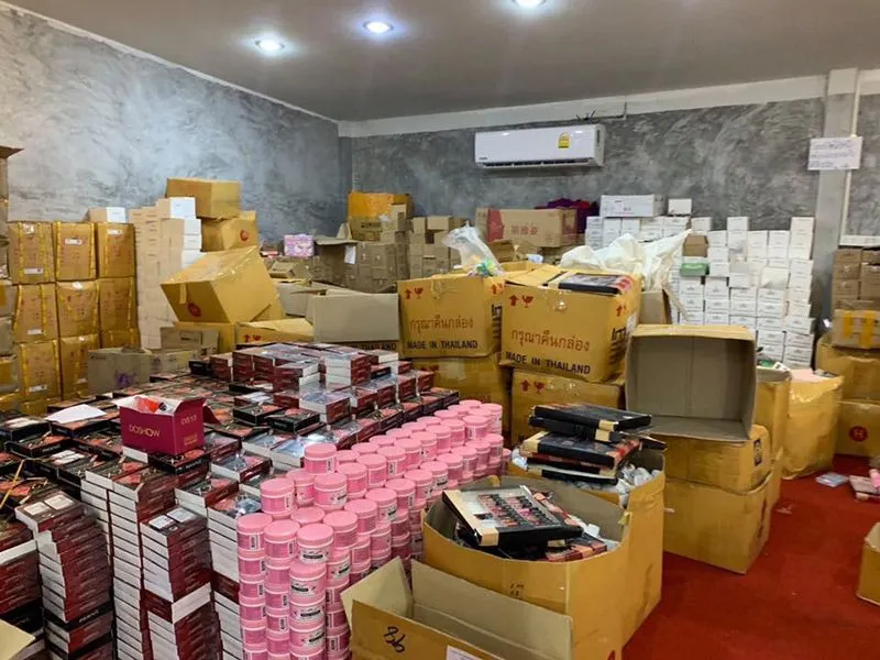 จนท. บุกตรวจโกดัง ราชินี บาร์เรีย แม่ค้าออนไลน์คนดัง พบครื่องสำอางเถื่อนเพียบ