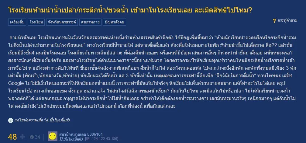 มันเกินไปไหม ละเมิดเกินไปหรือเปล่า ไม่ให้นักเรียนนำขวดน้ำพลาสติกก็ได้ แต่ขอเถอะนะ อนุญาตให้นำกระติกน้ำไปใส่น้ำกินเถอะ อย่าทำให้เด็กต้องอดน้ำระหว่างคาบเลยมันทรมานจริงๆ เหนื่อยมากๆ แต่กินน้ำไม่ได้ สงสัยถ้ายังไม่เลิกล้มระบบนี้คงต้องเอาแก้วไปกรอกน้ำก๊อกที่ห้องน้ำเพื่อกินแล้วหละ