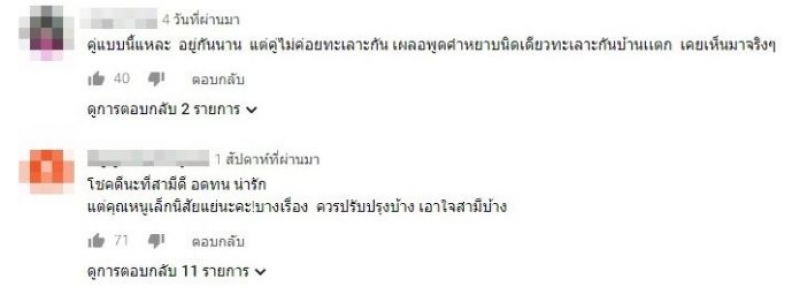 อาทิ โชคดีนะที่สามีดี อดทน น่ารัก แต่คุณหนูเล็กนิสัยแย่นะคะ!บางเรื่อง ควรปรับปรุงบ้าง เอาใจสามีบ้าง เป็นต้น ขณะที่ ก็มีคนเข้ามาโต้คนที่ต่อว่าหนูเล็กว่า ถ้าหนูเล็กแย่ในสายตาคนดูจริงๆ สามีนางคงทิ้งไปหาคนอื่นละ เขาคบเขาอยู่กันแบบเพื่อนไม่ใช่คู่รักสวีท