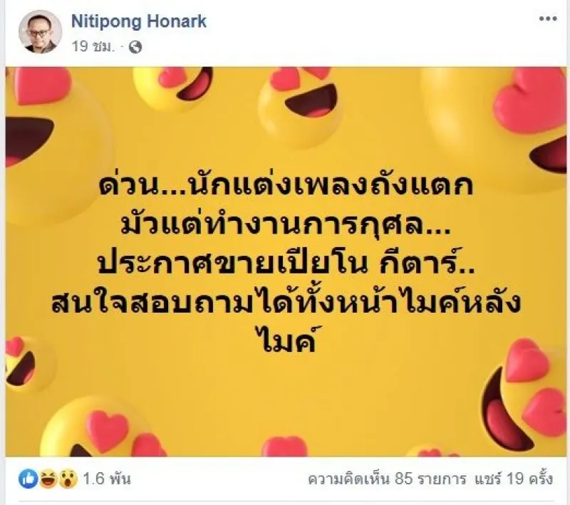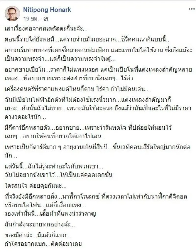 วันที่ 3 กรกฎาคม 2562 ที่ผ่านมา ผู้สื่อข่าวรายงานว่า โลกออนไลน์มีการเข้าไปแสดงความคิดเห็นบนเฟซบุ๊กของ ดี้ นิติพงษ์ ห่อนาค นักแต่งเพลงชื่อดัง โพสต์ข้อความบนเฟซบุ๊ก Nitipong Honark ประกาศทางขายเปียโน กีตาร์ หลังถังแตก โดยระบุว่า “ด่วน…นักแต่งเพลงถังแตก มัวแต่ทำงานการกุศล ประกาศขายเปียโน กีตาร์ สนใจสอบได้ทั้งหน้าไมค์หลังไมค์”