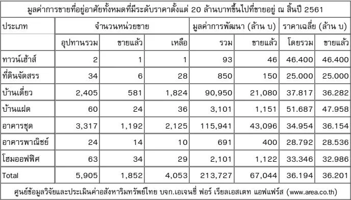 ดร.โสภณ พรโชคชัย ประธานศูนย์ข้อมูลวิจัยและประเมินค่าอสังหาริมทรัพย์ไทย บจก.เอเจนซี่ ฟอร์ เรียลเอสเตท แอฟแฟร์ส (www.area.co.th) เปิดเผยว่าตลาดที่อยู่อาศัยที่มีราคาตั้งแต่ 20 ล้านบาทขึ้นไปนั้น เป็นตลาดระดับหรูเลิศ ที่น่าสนใจเป็นอย่างยิ่ง แม้จะมีจำนวนน้อย แต่ก็มีมูลค่ามหาศาล โดย ณ สิ้นปี 2561 มีทั้งหมด 4,053 หน่วยที่เหลือเข้ามาขายในปี 2562 แต่มีมูลค่าสูงถึง 146,683 ล้านบาท หรือเท่ากับหน่วยละ 36.191 ล้านบาท