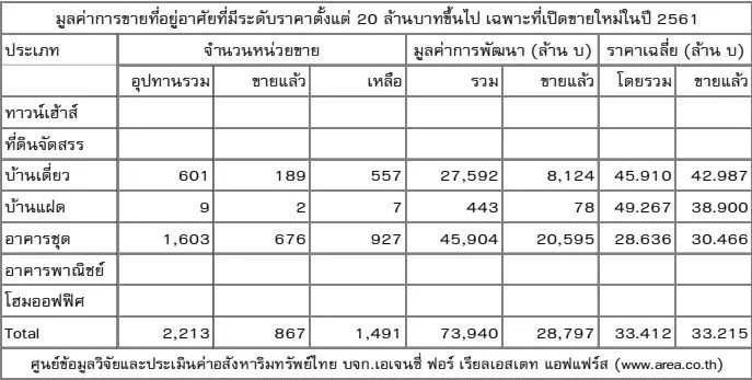 ในปี 2561 ที่อยู่อาศัยที่มีราคาเกิน 20 ล้านบาทเปิดตัวถึง 2,213 หน่วย หรือเท่ากับ 1.8% ของจำนวนหน่วยที่อยู่อาศัยเปิดใหม่ทั้งหมด แต่มีมูลค่า 73,940 ล้านบาท หรือ 14% ของมูลค่าการเปิดตัวทั้งหมด โดยมีโครงการอาคารชุด เปิดห้องชุดราคาเกิน 20 ล้านบาทถึง 1,603 หน่วย ขายได้แล้ว 676 หน่วย เหลืออยู่ 927 หน่วยรองลงมาคือ บ้านเดี่ยว 601 หน่วย ขายได้แล้ว 189 หน่วย เหลืออยู่ 557 หน่วย นอกนั้นยังมีบ้านแฝดอีกจำนวนหนึ่งเท่านั้น อาจกล่าวได้ว่าการเปิดตัวลดน้อยลงในปี 2561 สำหรับในไตรมาสที่ 1/2562 มีโครงการราคาแพงเกิน 20 ล้านบาทอยู่เพียง 18 หน่วย รวมมูลค่า 1,352 ล้านบาท หรือราคาหน่วยละ 75 ล้านบาท