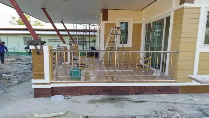 ด้านข้างตัวบ้านติดไม้ฝารอบๆบ้าน เพื่อเป็นการเพิ่มความสวยงามและลูกเล่นให้กับตัวบ้าน ทำให้มองดูแล้วมีมิติตัวบ้านไม่ทื่อแข็ง ด้านหน้าตรงระเบียงมาราวกั้นสแตนเลส ตลอดแนวเสาของระเบียง