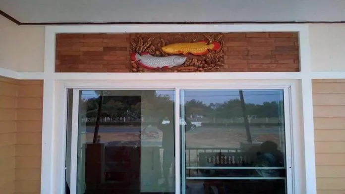 ประตูหน้าบ้านใช้แบบกระจกเลื่อน ติดบัวตามรอบกระจกและตัวบ้าน มองดูแล้วเป็นสัดเป็นส่วน ด้านบนของประตูประดับด้วยรูปปั้นปลาคราฟเงินปลาคราฟทอง เพื่อเป็นศิริมงคลเข้ามาสู่บ้าน ทำมาค้าขายรวย และนำความโลคดีมาให้