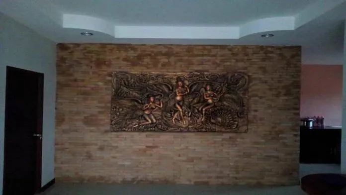 เมื่อเราเดินเข้ามาในบ้าน สิ่งแรกที่คุณจะเห็นเคยปติมากรรมที่สวยงาม บนพื้นผิวของผนัง ซึงผนังดังกล่าวได้ ตกแต่งด้วยลายอิฐ ประดับด้วย รูปปั้นวรรณกรรมลายไทยที่สวยงาม ด้านบนเพดานและผนังทาด้วยสีขาว ช่วยให้ในตัวบ้านดูสะอาด เรียบร้อย