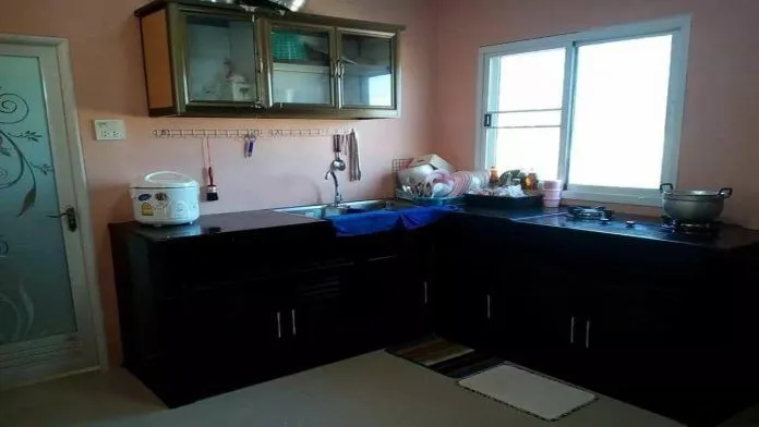 ตรงพื้นที่ครัว ใช้สีทาพนังโทนสีชมพู มีการติดตั้งที่ล้างจาน และเค้าเตอร์ไว้ตรงมุมของห้อง ติดหน้าต่าง เพื่อให้แสงรอดเข้ามา ทำให้ไม่จำเป็นต้องเปิดไฟ โดยอาศัยแสงไฟจากธรรมชาติ ด้านล่างของเค้าเตอร์ ไว้เป็นที่สำหรับเก็บของ ตรงด้านล่าง ด้านบนมีการติดตั้งตู้ลอย ไว้สำหรับเป็นที่เก็บถ้วยชามได้อีกด้วย ขอขอบคุณข้อมูล และภาพประกอบจาก : หจก.กูรู แอร์ เซอร์วิส