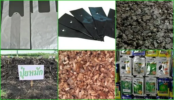 -ถุงหิ้ว ถุงดำ หน้าดิน ปุ๋ยหมัก ขุยมะพร้าวละเอียด เมล็ดพันธุ์ ผสมดินใช้สูตร 2-1-1 คือ ดิน 2 ส่วน ปุ๋ยหมัก 1 ขุยมะพร้าวสับ 1 ส่วน