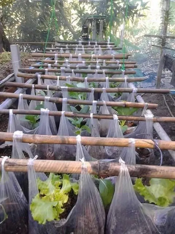 หลังจากนั้นให้นำไม้ไผ่มาทำเป็นราวเพื่อห้อยถุงพลาสติกไว้ เพื่อการระบายน้ำที่ดีขึ้นนั่นเอง ข้อดีช่วยประหยัดพื้นที่ในการปลูกพืชที่ต้องใช้พื้นที่และดินในปริมาณมาก ประหยัดต้นทุนในการซื้อกระถาง