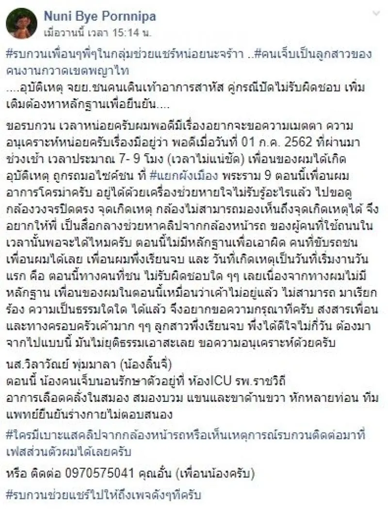 วันที่ 5 กรกฎาคม เพจผู้ใช้เฟซบุ๊กชื่อ Nuni Bye Pornnipa หลังจากที่ได้โพสต์ภาพพร้อมข้อความระบุว่า รบกวนเพื่อนๆพี่ๆช่วยแชร์ คนเจ็บเป็นลูกสาวของคนงานกวาดเขตพญาไท อุบัติเหตุ จยย.ชนคนเดินเท้าอาการสาหัส คู่กรณีปัดไม่รับผิดชอบ ต้องหาหลักฐานเพื่อยืนยัน