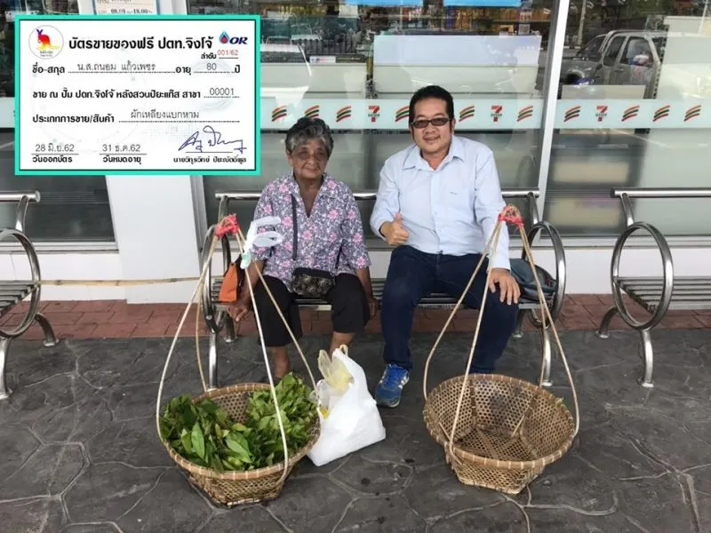 จึงได้ทราบว่าหญิงชราผู้นั้นชื่อ น.ส.ถนอม แก้วเพชร หรือ ป้าหนอม อายุ 80 ปี เป็นชาวตำบลบ้านควน หมู่ 1 อ.หลังสวน และทุกวันป้าหนอมจะหาบผักเหลียงเข้ามาวางขายในปั๊มประมาณ 40 กำ ราคากำละ 20 บาท โดย น.ส.ถนอม ต้องหาบผักเหลียงเดินเท้าจากบ้านซึ่งห่างจากปั๊มน้ำมันประมาณ 3 กิโลเมตร มาขายในบริเวณปั๊มน้ำมันของตนทุกวันตั้งแต่เวลา 09.00 น.จนกว่าจะขายหมด ตนจึงมีแนวคิดที่จะจัดสถานที่ในปั๊มน้ำมัน ปตท.จิงโจ้ ทุกสาขา เพื่อให้ผู้สูงอายุที่ยังต้องต่อสู้ชีวิตได้นำสินค้า พืชผลทางการเกษตร มาวางจำหน่ายได้ฟรี โดยไม่ต้องเสียค่าเช่าพื้นที่แต่อย่างใด