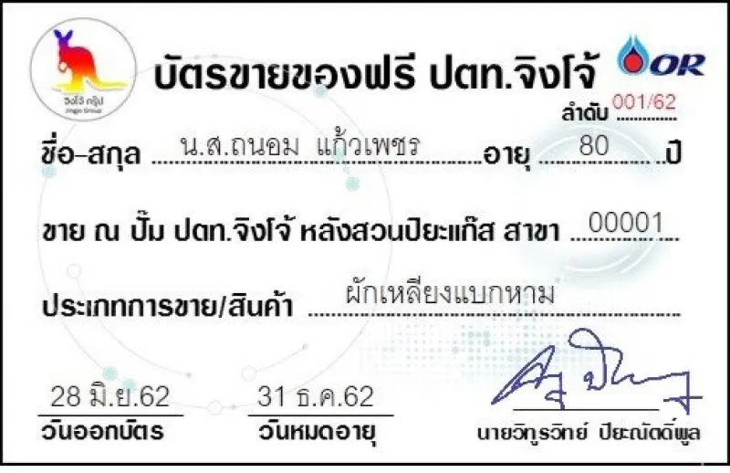 ขณะนี้ จึงได้จัดทำบัตรขายของฟรีในปั๊มน้ำมัน ปตท.จิงโจ้ ประเภทสินค้า ผักเหลียงแบกหาม ซึ่งเป็นบัตรใบแรกให้แก่ คุณป้าถนอมเรียบร้อยแล้ว และปั๊มน้ำมัน ปตท.จิงโจ้ พร้อมที่จะมอบสิทธิพิเศษแก่ผู้สูงอายุที่ยังต่อสู้ชีวิตรายอื่นๆ ให้สามารถนำสินค้ามาขายสินค้าได้ฟรีในปั๊มน้ำมัน ปตท.จิงโจ้ ใกล้บ้านของผู้สูงอายุท่านนั้น หากใครพบเห็นผู้สูงอายุที่ต่อสู้ชีวิตเช่นนี้ ขอความกรุณาติดต่อได้ที่ปั๊ม ปตท.จิงโจ้ สาขานั้นได้ทันที นายวิทูรวิทย์ กล่าว
