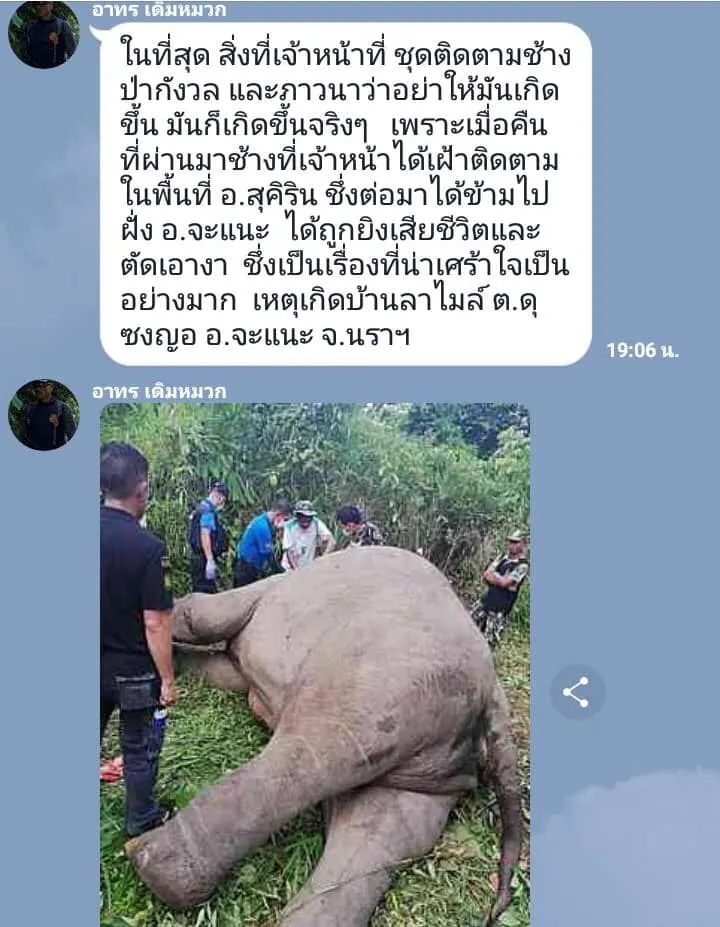 เมื่อวันที่ 5 กรกฎาคม 2562 เวลา 10.00 น.ได้รับแจ้งจากผู้ใหญ่บ้าน บ้านลาไม ม.5 ต.บองอ อ ระแงะ จ.นราธิวาส ว่าได้มีคนร้ายไม่ทราบจำนวน ใช้อาวุธปืนไม่ทราบชนิดและขนาด ยิงช้างป่าซึ่งพลัดหลงเข้ามาในหมู่บ้านลาไมเสียชีวิต จำนวน 1 เชือก และตัดเอางาช้างไปจากการสอบถามเจ้าหน้าที่ป่าไม้เขตรักษาพันธ์ุสัตว์ป่าฮาลาบาลา ซึ่งติดตามช้างเชือกดังกล่าวมาตั้งแต่อำเภอสุคิริน ทราบว่า ช้างเชือกนี้อายุประมาณ 18-20 ปีได้เข้ามาอยู่ในพื้นที่บ้านลาไม ประมาณ 1 อาทิตย์ และอยู่ในระหว่างการติดตามและผลักดันเข้าสู่ป่าของเจ้าหน้าที่ป่าไม้ คาดว่าคนร้ายน่าจะก่อเหตุหลังเที่ยงคืนของคืนวันที่ 4 กรกฎาคม 2562(วันที่ 5 กรกฎาคม 2562) ขณะนี้นายอำเภอระแงะ ได้มอบหมายให้เจ้าหน้าที่ป่าไม้เขตรักษาพันธ์ุสัตว์ป่าฮาลาบาลาและผู้ใหญ่บ้านบ้านลาไม ไปแจ้งความดำเนินคดีเพื่อหาตัวผู้กระทำผิดมาดำเนินคดีตามกฎหมายต่อไป