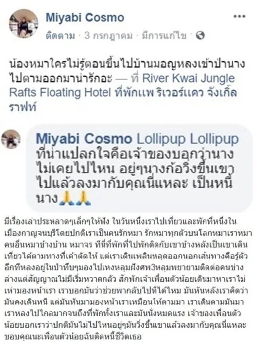 ในโลกออนไลน์ได้มีกระแสฮือฮาเรื่องราวสุดประทับใจ หลังจากมีสมาชิกเฟสบุ๊ก Miyabi Cosmo ได้ออกมาโพสต์เรื่องราวของตนเอง ปกติเป็นคนรักสุนัขทุกตัวบนโลก ทั้งหมาตัวเอง หมาคนอื่น หมาจร โดยขณะไปเที่ยวกาญจนบุรี เดินเล่นไปด้านหลังที่พักซึ่งเป็นเขา โดยเดินเพลินหลุดออกไปนอกเส้นทาง