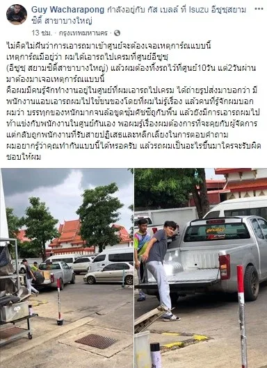 เมื่อวันที่ 6 กรกฎาคม 2562 จากกรณีที่ผู้ใช้เฟซบุ๊กชื่อ “Guy Wacharapong” ได้โพสต์ภาพขณะที่พนักงานของศูนย์บริการแห่งหนึ่งได้นำเอารถยนต์ของเจ้าตัวไปใช้นั้น โดยได้โพสต์ภาพและข้อความระบุว่า “ไม่คิดไม่ฝันว่าการเอารถมาเข้าศูนย์จะต้องเจอเหตุการ์ณแบบนี้ เหตุการ์ณมีอยู่ว่า ผมได้เอารถไปเครมที่ศูนย์อีซูซุ (อีซูซุ สยามซิตี้สาขาบางใหญ่) แล้วผมต้องทิ้งรถไว้ที่ศูนย์10วัน แต่2วันผ่านมาต้องมาเจอเหตุการ์ณแบบนี้ คือผมมีคนรู้จักทำงานอยู่ในศูนย์ที่ผมเอารถไปเครม ได้ถ่ายรูปส่งมาบอกว่า มีพนักงานแอบเอารถผมไปใช้ขนของโดยที่ผมไม่รู้เรื่อง แล้วคนที่รู้จักผมบอกผมว่า บรรทุกของหนักมากจนล้อขูดซุ้มคัชซีถูกับพื้น แล้วยังมีการเอารถผมไปท้าแข่งกับพนักงานในศูนย์กันเอง พอผมรู้เรื่องผมต้องการที่จะคุยกับผู้จัดการแต่กลับถูกพนักงานที่รับสายปฏิเสธและหลีกเลี่ยงในการตอบคำถาม ผมอยากรู้ว่าคุณทำกันแบบนี้ได้หรอครับ แล้วรถผมเป็นอะไรขึ้นมาใครจะรับผิดชอบให้ผม” จนเป็นกระแสวิพากษ์วิจารณ์กันในโลกออนไลน์