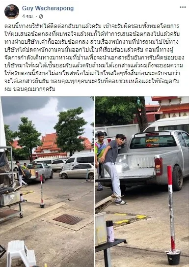 ล่าสุดเจ้าของเฟซบุ๊กคนดังกล่าวได้ออกมาโพสต์ข้อความระบุว่า “ตอนนี้ทางบริษัทได้ติดต่อกลับมาแล้วครับ เข้าจะรับผิดชอบทั้งหมดโดยการให้ผมเสนอข้อตกลงที่ผมพอใจแล้วผมก็ได้ทำการเสนอข้อตกลงไปแล้วครับ ทางฝ่ายบริษัทเค้าก็ยอมรับข้อตกลง ส่วนเรื่องพนักงานที่นำรถผมไปใช้ทางบริษัทได้ปลดพนักงานคนนั้นออกไปเป็นที่เรียบร้อยแล้วครับ ตอนนี้ทางผู้จัดการกำลังเดินทางมาหาผมที่บ้านเพื่อจะนำเอกสารยืนยันการรับผิดชอบของบริษัทมาให้ผมได้เซ็นยอมรับแล้วครับถ้าผมได้เอกสารแล้วผมถึงจะยอมความให้ครับตอนนี้ยังขอไม่ลบโพสหรือไม่แก้ไขโพสใดๆทั้งสิ้นก่อนนะครับจนกว่าจะได้เอกสารยืนยัน ขอบคุณทุกๆคนนะครับที่คอยช่วยเหลือและให้ข้อมูลกับผม ขอบคุณมากๆครับ