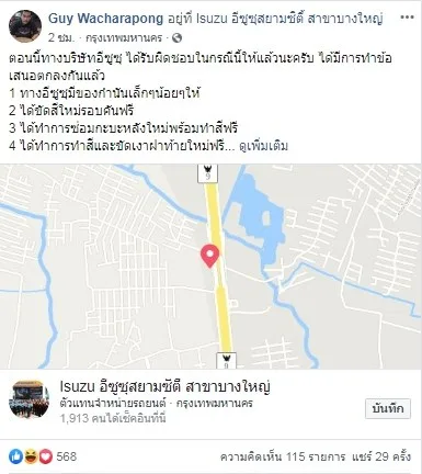 ตอนนี้ทางบริษัทอีซูซุ ได้รับผิดชอบในกรณีนี้ให้แล้วนะครับ ได้มีการทำข้อเสนอตกลงกันแล้ว