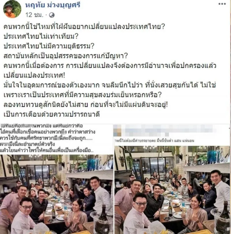 โดย อุ๊ หฤทัย ได้โพสต์ข้อความระบุด้วยว่า คนพวกนี้ใช่ไหมที่ใฝ่ฝันอยากเปลี่ยนแปลงประเทศไทย ประเทศไทยไม่เท่าเทียม ?