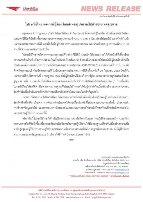 อนึ่ง สิ่งมีค่าทุกประเภท รวมถึงทองคำและทองรูปพรรณ เป็นสิ่งต้องห้ามฝากส่งทางไปรษณีย์ ซึ่งผู้ใช้บริการสามารถสอบถามข้อมูลสิ่งของห้ามฝากส่ง หรือพบปัญหาสิ่งของสูญหายและได้รับความไม่สะดวกในการใช้บริการของไปรษณีย์ไทย สามารถแนะนำบริการต่างๆ ได้ที่ THP Contact Center 1545 ทั้งนี้ ผู้ร้องเรียนได้รับแจ้งจากผู้รับปลายทางว่า ทองรูปพรรณที่จัดส่งสูญหายเหลือ 1 บาท ดังนั้นจึงได้ทำการขอสอบสวนไปยังที่ทำการไปษณีย์จังหวัดสุพรรณบุรี ในเบื้องต้นไปรษณีย์ไทยได้ชดใช้ค่าเสียหายตามมาตรฐานที่ไปรษณีย์กำหนดให้กับผู้ฝากส่งในเบื้องต้นแล้ว และจะตรวจสอบข้อเท็จจริงเพื่อดำเนินการเกี่ยวกับการชดใช้ค่าเสียหายให้เหมาะสมโดยเร็วที่สุดต่อไป จากกรณีดังกล่าว ไปรษณีย์ไทยมอบหมายให้เจ้าหน้าที่ที่เกี่ยวข้องเข้าพบผู้ร้องเรียน เพื่อรับทราบข้อเท็จจริงเพิ่มเติม เนื่องจากการส่งระหว่างประเทศได้คาบเกี่ยวในหน้าที่ของหลายหน่วยงาน ดังนั้นจะทำการสืบหาข้อมูลต่อไป และหากพบการผิดพลาดในกระบวนการของไปรษณีย์ไทย พร้อมที่จะรับผิดชอบต่อไปและขออภัยผู้ใช้บริการมา ณ ที่นี้