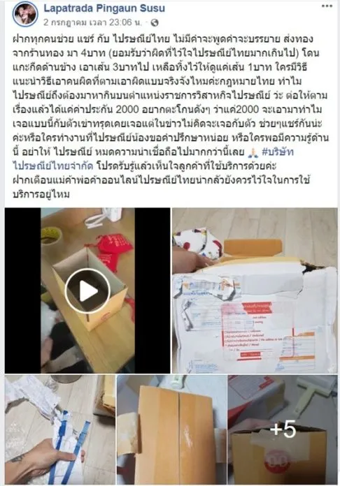 จากข่าวสาวโวย! ส่งทอง 4 บาทเหลือแค่บาทเดียว ไปรษณีย์เปิดวงจรปิดเช็กเจออยู่ครบ จากกรณีผู้ใช้เฟซบุ๊กชื่อ Lapatrada Pingaun Susu โพสต์ข้อความเตือนผู้ใช้บริการจัดส่งพัสดุของไปรษณีย์ไทย ภายหลังสั่งทองคำจากประเทศไทยน้ำหนัก 4 บาท และเมื่อของไปถึงปลายทางปรากฏว่าทองคำหายไป 3 บาท เหลือเพียงทอง 1 บาท ไว้ดูต่างหน้านั้น ขณะที่ บริษัท ไปรษณีย์ไทย จำกัด (ปณท) ออกเอกสารชี้แจงว่า “ไปรษณีย์ไทย หลังจากทราบเหตุการณ์ดังกล่าว ก็มิได้นิ่งนอนใจ ได้มอบหมายให้เจ้าหน้าที่ที่เกี่ยวข้องตรวจสอบข้อเท็จจริงเป็นการเร่งด่วน