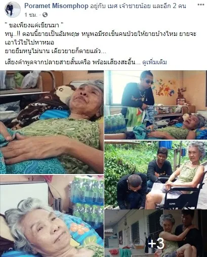ขอเพียงแค่เขียนมา หนู ตอนนี้ยายเป็นอัมพฤษ หนูพอมีรถเข็นคนป่วยให้ยายบ้างไหม ยายจะเอาไว้ใช้ไปหาหมอ ยายยืมหนูไม่นาน เดียวยายก็ตายแล้ว เสียงคำพูดจากปลายสายสั่นเครือ พร้อมเสียงสะอื้น ไม่ผิดแน่จากที่เมศได้ยิน หญิงชราคนนั้นกำลังร้องไห้ และโทรมาขอความช่วยเหลือ หลังจากวางสายเมศไม่รอช้า รีบหาข้อมูลทุกอย่างที่รู้และรีบเดินทางไปหาทันที น้ำตาจะไหล เมศ ไม่รอช้า เช็คข้อมูล แบกขึ้นรถ เอาไปส่งให้คุณยายถึงที่ นับถือหัวใจจริงๆ โดยผู้ใช้เฟซบุ๊กดังกล่าว ได้ระบุข้อความเอาไว้ว่า...