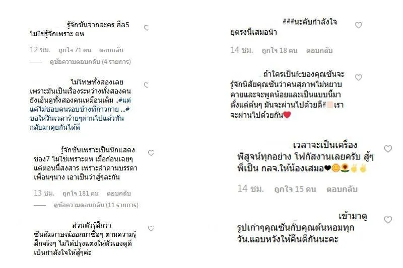 ก่อนที่จะมีชาวเน็ตเข้ามาคอมเม้นต์อาทิ คำว่าไม่ทิ้งน้องบลูคือ พี่น้องเขาไม่ทอดทิ้งกันในวันที่มีปัญหา เพราะปัญหาเกิดจากซัน คือนี่ตีความแบบนี้นะ , รู้จักซันเพราะเป็นนักแสดงช่อง7 ไม่ใช่เพราะตห เมื่อก่อนเฉยๆ แต่ตอนนี้สงสารเพราะรำคาญบรรดาเพื่อนๆนาง เอาเป็นว่าสู้ๆละกัน , สู้ๆนะซัน ทำใจให้ได้กับความวุ่นวาย , สู้ๆๆครับ , ไม่โทษทั้งสองเลย เพราะมันเป็นเรื่องระหว่างทั้งสองคน ยังเอ็นดูทั้งสองคนเหมือนเดิม ..แต่แค่ไม่ชอบคนรอบข้างที่ก่าวก่าย ...#ขอให้วันเวลาร้ายๆผ่านไปแล้วหันกลับมาคุยกันได้ดี ฯลฯ กันอย่างมากมาย