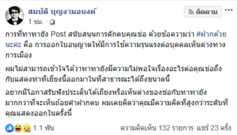 ล่าสุดผู้ใช้เฟซบุ๊กชื่อ สมบัติ บุญงามอนงค์ ได้ออกมาโพสต์ถึงกรรีดังกล่าวโดยระบุข้อความว่า การที่ทาทายัง Post สนับสนุนการดักตบคุณช่อ ด้วยข้อความว่า #ฝากด้วยนะค่ะ คือ การออกใบอนุญาตให้มีการใช้ความรุนแรงต่อบุคคลเห็นต่างทางการเมือง ผมไม่สามารถเข้าใจได้ว่าทาทายังมีความไม่พอใจเรื่องอะไรต่อคุณช่อถึงกับแสดงท่าทีเยี่ยงนี้ออกมาในที่สาธารณะได้ถึงขนาดนี้ อยากมีโอกาสรับฟังประเด็นโต้เถียงหรือเห็นต่างของช่อกับทาทายังมากกว่าที่จะเห็นถ้อยคำฝากตบ ผมเคยคิดว่าคุณมีความคิดที่สูงกว่าระดับที่คุณแสดงออกในครั้งนี้