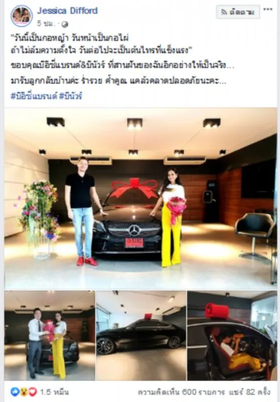 ล่าสุด เธอได้อัพเดทชีวิตของเธอที่ได้จูงมือหนุ่มสติ๊ก ไปถอยรถเบนซ์ป้ายแดง พร้อมกับโพสต์ข้อความว่า วันนี้เป็นกอหญ้า วันหน้าเป็นกอไผ่ ถ้าไม่ล้มความตั้งใจ วันต่อไปจะเป็นต้นไทรที่แข็งแรง ขอบคุณบีอีซี่แบรนด์ บีนัวร์ ที่สานฝันของฉันอีกอย่างให้เป็นจริง มารับลูกกลับบ้านค่ะ ร่ำรวย ค้ำคูณ แคล้วคลาดปลอดภัยนะคะ