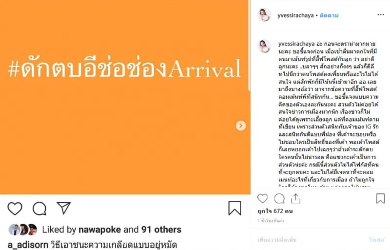 ขอชี้แจงแบบความคิดของตัวเองละกันนะคะ ส่วนตัวไม่ค่อยได้สนใจข่าวการเมืองมากนัก เรื่องข่าวก็ไม่ค่อยได้ดูเพราะเลี้ยงลูก แต่ที่คอมเมนต์ตามที่เขียน เพราะส่วนตัวสนิทกับเจ้าของ IG รักและสนิทกันดีแบบพี่น้อง พี่เค้าจะชอบหรือไม่ชอบใครเป็นสิทธิ์ของพี่เค้า พอเค้าโพสต์ ก็เลยหยอกเค้าไปเฉยๆว่าถ้าเค้าจะดักทำใครคนนั้นไม่น่ารอด คือแซวกะเค้าเป็นการส่วนตัวน่ะค่ะ
