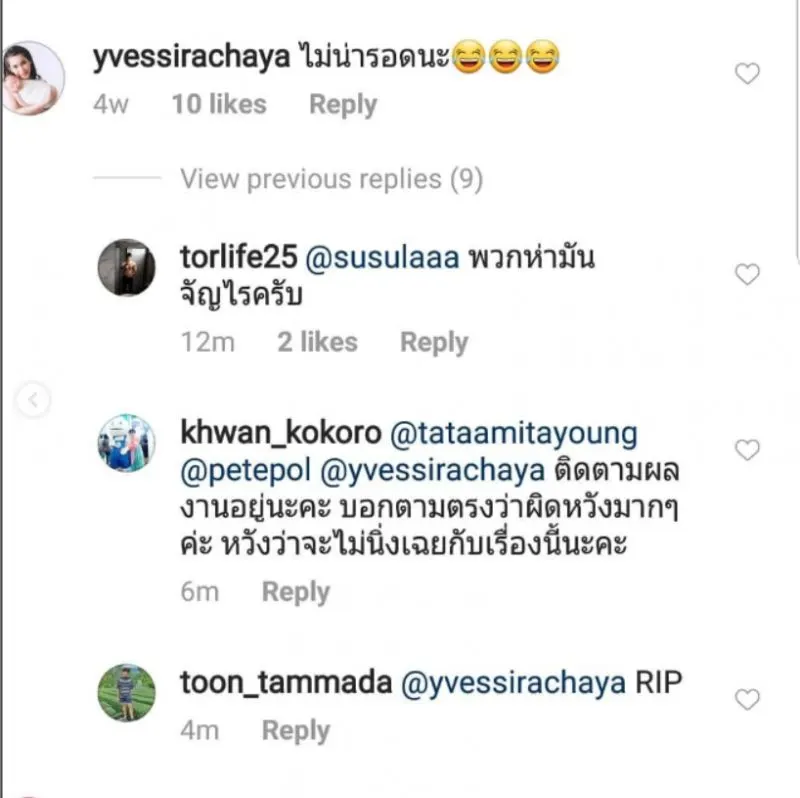 โดย อีฟ พุทธธิดา ลูกสาว ต้อย เศรษฐา ดาราอาวุโสชื่อดัง ได้เข้าไปคอมเมนต์ในโพสต์ดังกล่าวเช่นกันว่า “ไม่น่ารอด” หลังจากที่โดนดราม่า อีฟ ได้โพสต์ชี้แจงว่า
