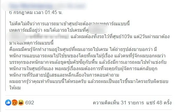 เจ้าของโพส ได้โพสต์ภาพพร้อมข้อความระบุว่า ไม่คิดไม่ฝันว่าการเอารถมาเข้าศูนย์จะต้องเจอเหตุการ์ณแบบนี้ เหตุการ์ณมีอยู่ว่า ผมได้เอารถไปเครมที่ศูนย์บริการแห่งหนึ่ง ย่านบางใหญ่ แล้วผมต้องทิ้งรถไว้ที่ศูนย์ 10 วัน แต่2วันผ่านมา ต้องมาเจอเหตุการ์ณแบบนี้