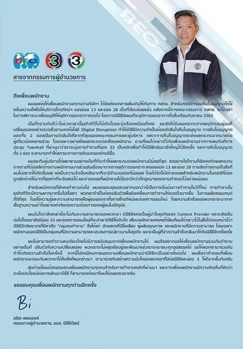 9 ก.ค. 2562 มีรายงานว่า ผู้บริหารช่อง 3 ร่อนหนังสือแจ้งพนักงาน แจงความจำเป็นในการคืนใบอนุญาต 2ช่อง ส่งสัญญาณลดพนักงานล็อตใหญ่ กว่า 200 คน พร้อมชดเชยตามกฎหมาย