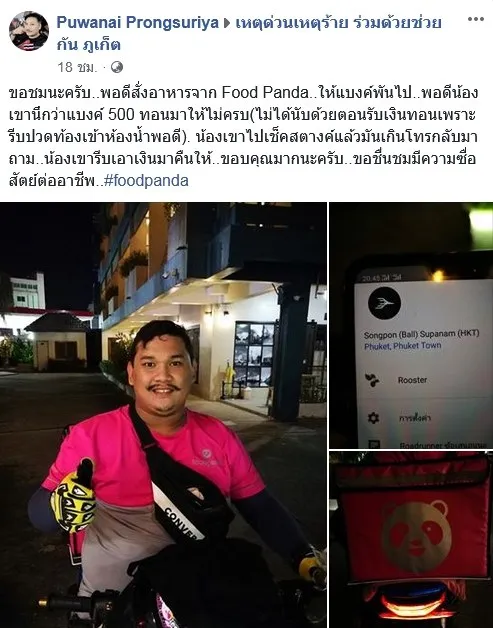 ขอชมนะครับพอดีสั่งอาหารจาก Food Pandaให้แบงค์พันไปพอดีน้องเขานึกว่าแบงค์ 500 ทอนมาให้ไม่ครบ(ไม่ได้นับด้วยตอนรับเงินทอนเพราะรีบปวดท้องเข้าห้องน้ำพอดี). น้องเขาไปเช็คสตางค์แล้วมันเกินโทรกลับมาถามน้องเขารีบเอาเงินมาคืนให้..ขอบคุณมากนะครับขอชื่นชมมีความซื่อสัตย์ต่ออาชีพ #foodpanda