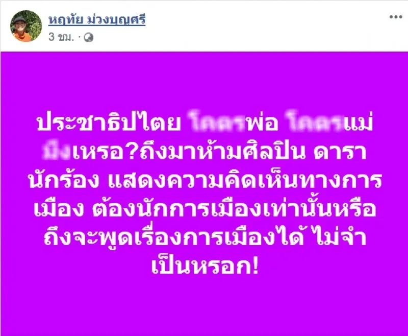 ถึงตอนนี้คงไม่มีใครจะไม่รู้จัก ศิลปิน-นักร้อง หฤทัย ม่วงบุญศรี เจ้าของเพลงดังในยุค 90 หลายเพลง ที่ระยะหลังสาวอุ๊ มักจะมีวาทะแรงๆมาเคลื่อนไหวอยู่ในสังคมโซเชียลชนิด วันต่อวันกันเลยทีเดียว ซึ่งล่าสุดเมื่อคืนวันที่ 9 ก.ค. เธอได้โพสต์เรื่องราวผ่านเฟซบุ๊กดังนี้