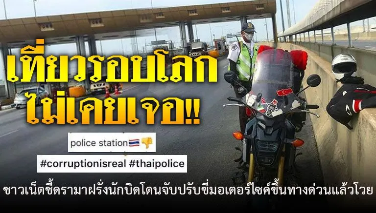 ชาวเน็ตชี้แจงตอบโต้นักบิดมอเตอร์ไซค์ชาวสวีเดน กรณีโพสต์ข้อความกฏหมายไทยล้าหลัง จากเหตุขี่มอเตอร์ไชค์ขึ้นทางด่วนและถูกจับปรับ 1,000 บาท ณ จุดเกิดเหตุตามกฏหมาย โดยไม่ต้องไปโรงพักแต่ฝรั่งเข้าใจผิด ติดแฮชแท็กกว่า คอรัปชั่น ตำรวจไทย และ รถจักรยานยนต์ท่องเที่ยว