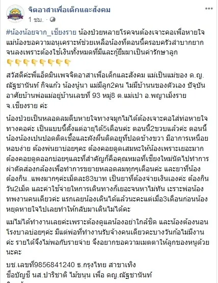 เมื่อวันที่ 10 พ.ค. 62 ทางด้านผู้ใช้เพจเฟสบุ๊ก จิตอาสาเพื่อเด็กและสังคม ได้ออกมาเผยแพร่เรื่องสุดน่าสงสารพร้อมระบุข้อความเอาไว้ว่า น้องน้อยจากเชียงราย น้องป่วยหลายโรคจนต้องเจาะคอเพื่อหายใจ แม่น้องขอความอนุเคราะห์ช่วยเหลือน้องที่ตอนนี้ครอบครัวลำบากยากจนลงเพราะต้องใช้เงินทั้งหมดที่มีและกู้ยืมมาเป็นค่ารักษาลูก