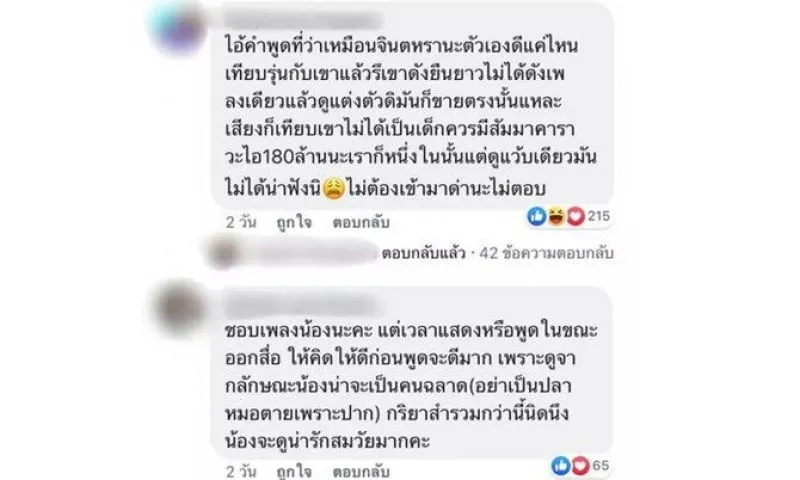 พี่จิน - "พี่ก็ให้กำลังใจน้อง และก็เชื่อว่าทุกคนก็จะให้กำลังใจน้องเหมือนกัน ก็ขอให้น้องเดินหน้าทำงานต่อไป เขาเป็นเด็กที่ใสๆ จริงๆค่ะ เขายังต้องอยู่ในวัยเรียน ยังต้องทำงานช่วยเหลือครอบครัว ช่วยเหลือพ่อแม่ พี่ก็อยากให้เขาโฟกัสไปกับเรื่องของเสียงเพลงดีกว่า ไม่อยากให้น้องต้องตกใจ"
