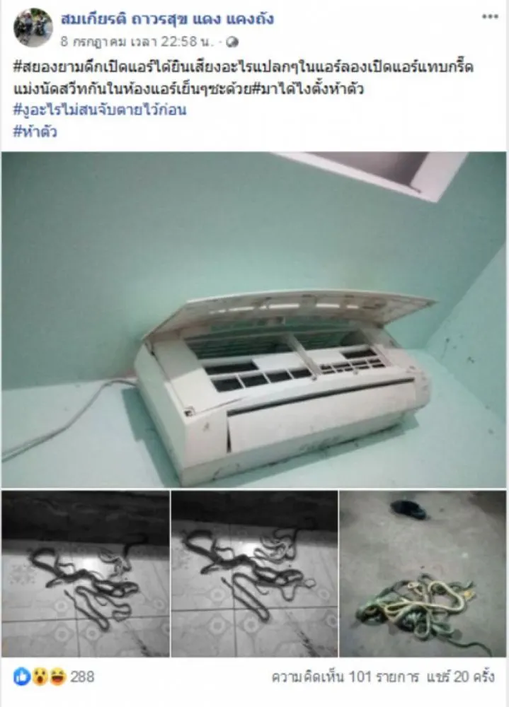 วันที่ 11 กรกฎาคม 2562 ผู้สื่อข่าวรายงานว่า โลกออนไลน์มีการแชร์ภาพเหตุการณ์ของผู้ใช้เฟซบุ๊กชื่อ สมเกียรติ ถาวรสุข แดง แคงถัง เป็นภาพกองงูที่รวมตัวกันเป็นกระจุก โดยระบุข้อความว่า #สยองยามดึกเปิดแอร์ได้ยินเสียงอะไรแปลกๆในแอร์ลองเปิดแอร์แทบกรี๊ดแม่งนัดสวีทกันในห้องแอร์เย็นๆซะด้วย#มาได้ไงตั้งห้าตัว #ห้าตัว