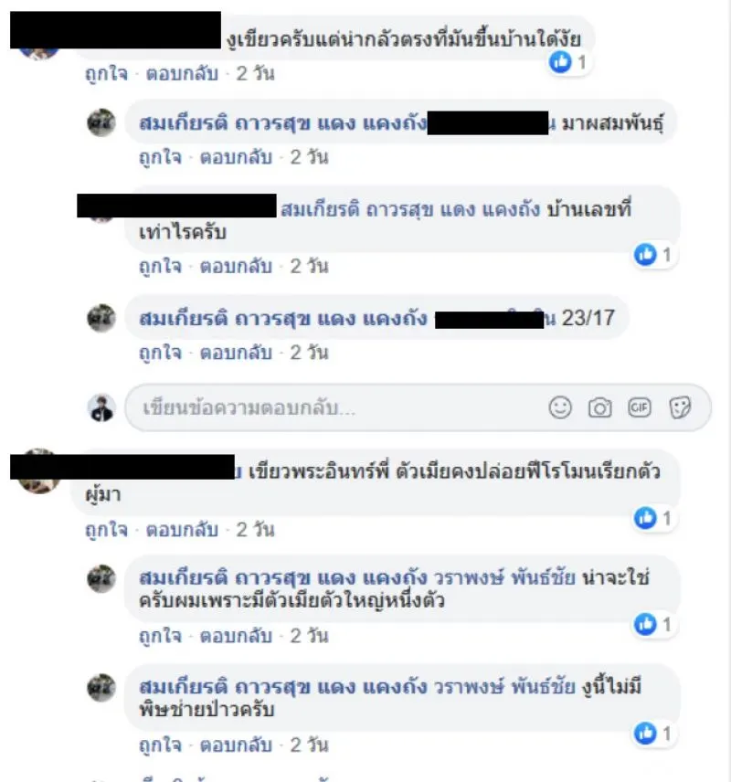 ด้านชาวโซเชียลได้ต่างเข้ามาแสดงความคิดเห็นบอกว่างูที่เจ้าของโพสต์พบ เป็นงูเขียวพระอินทร์ ซึ่งคาดว่าตัวเมียคงปล่อยฟีโรโมน เพื่อเรียกตัวผู้มา