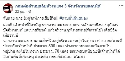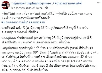 จากกรณี ผู้ใช้เฟซบุ๊ก ชื่อ กลุ่มต่อต้านมุสลิมหัวรุนแรง 3 จังหวัดชายแดนใต้ ได้ออกมาเผยแพร่โพสต์ ซึ่งเป็นเรื่องราวสุดเศร้า 2คู่รัก ที่ไม่สามารถสื่อสารด้วยคำพูด เพราะเขาเป็นใบ้ ถูกคนร้ายประกบยิง ภรรยาถูกยิงบาดเจ็บก่อน เสียชีวิตที่โรงพยาบาล กรีดร้องโดยไม่มีเสียง จากพิษบาดแผลและเรียกหาสามีอันเป็นที่รักที่เสียชีวิตที่เกิดเหตุ โครตเศร้า โดยผู้ใช้เฟซบุ๊กดังกล่าว ได้ระบุข้อความเอาไว้ว่า