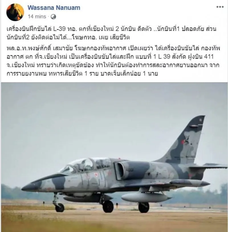 จากกรณีเครื่องบินขับไล่ แอล39 ของกองทัพอากาศตกบริเวณหมู่บ้านเกาะกลาง หมู่ 8 ต.ป่าแดด อ.เมืองเชียงใหม่ โดยชาวบ้านเห็นนักบิน 2 นายดีดตัวออกมาจากเครื่อง โดยคนหนึ่งร่มไม่กาง ส่วนอีกคนร่มกางตามปกติ ซึ่งมีรายงานว่ามีผู้เสียชีวิตเป็นครูฝึก ส่วนอีกนายเป็นลูกศิษย์ ได้รับบาดเจ็บเล็กน้อย ตามที่เสนอข่าวไปแล้วนั้น