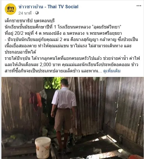 เมื่อวันที่ 11 ก.ค. 62 ทางด้านผู้ใช้เพจเฟสบุ๊ก ข่าวชาวบ้าน–Thai TV Social ได้ออกมาเผยแพร่เรื่องราวครอบสุดสงสารพร้อมระบุข้อความเอาไว้ว่า เด็กชายชนาธิป บุตรคอนบุรี นักเรียนชั้นมัธยมศึกษาปีที่ 1 โรงเรียนนครหลวง อุดมรัชต์วิทยาที่อยู่ 20/2 หมู่ที่ 4 ต.หนองปลิง อ.นครหลวง จ.พระนครศรีอยุธยา