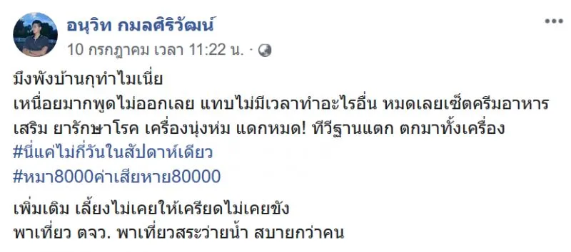 โดยได้ระบุไว้ว่า "พังบ้านทำไมเนี่ย เหนื่อยมากพูดไม่ออกเลย แทบไม่มีเวลาทำอะไรอื่น หมดเลยเซ็ตครีม เครื่องนุ่งห่ม แดกหมด! ทีวีฐานแตก ตกมาทั้งเครื่อง
