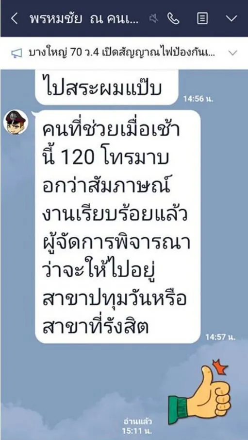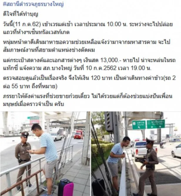 ทราบชื่อเจ้าของโพสต์คือ ร.ต.อ.พงศ์ศักดิ์ จูมแพง รองสารวัตรปราบปรามสภ.บางใหญ่ เล่าให้ฟังว่า ตอนนั้นหนุ่มคนดังกล่าวเดินเข้ามาถามว่า จะไปสมัครที่สยามต้องไปยังไง พอบอกเส้นทางให้เสร็จ เขาเล่าว่ากระเป๋าเงินเขาหาย น่าจะหล่นบนแท็กซี่ ไม่รู้จะทำยังไง ต้องนอนที่ป้ายรถเมล์ทั้งคืน พอตรวจสอบว่าเป็นเรื่องจริง ก็ให้เงินไป 120 บาท สงสารเพราะสีหน้าเขามาด้วยความหวัง เขามาจากต่างจังหวัดคงไม่รู้จะไปพึ่งใคร