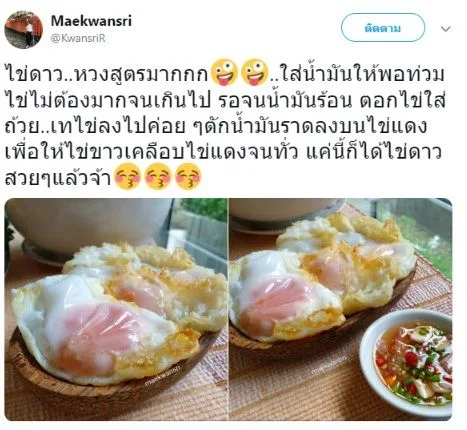 อย่างผู้ใช้ทวิตเตอร์ Maekwansri ที่ออกมาแจกสูตรการทอดไข่ดาว ที่ตนเองนั้นบอกว่าหวงสูตรมากๆ แต่ก็ยินดีมาบอกเทคนิคเล็กๆ น้อยๆ ให้กับชาวเน็ต