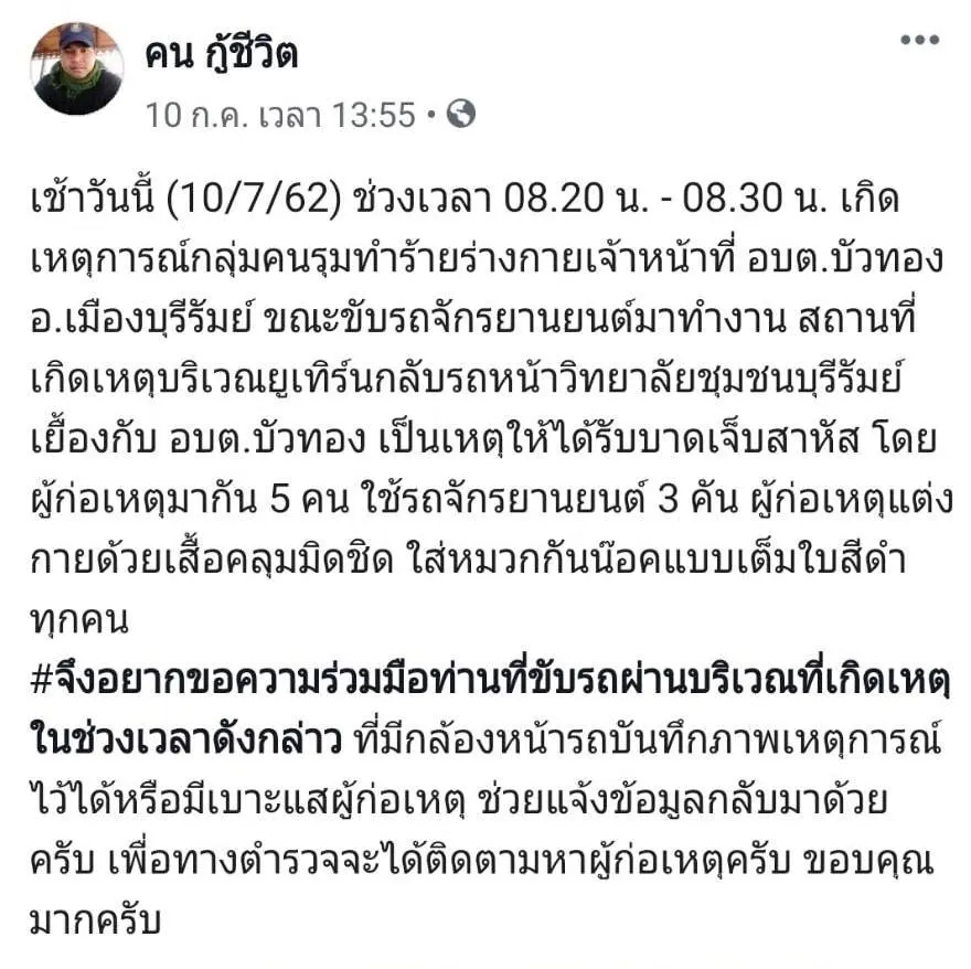 ***สิ่งที่เฟสบุ๊คคน กู้ชีวิต ของนายสุเมธ โพสต์เรียกร้อง เพื่อขอเบาะแส และกล้องหน้ารถจากผู้ผ่านไปมาน่าจะเห็นกลุ่มคนร้าย และรูปพรรณรถ เพื่อมอบให้ตำรวจ สภ.เมืองบุรีรัมย์ ช่วยติดตามตัวผู้ก่อเหตุ***